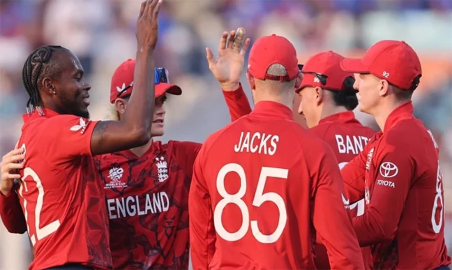 টস জিতে ব্যাটিংয়ে নামা ইংল্যান্ডের উদ্বোধনী জুটি ভাঙে তৃতীয় ওভারের প্রথম বলে ২১ রানে, জস বাটলারের (৩) বিদায়ে। পরের ব্যাটাররা শুরু পেলেও কেউই ক্রিজে থিঁতু হতে পারেননি। ওপেনার ফিল সল্ট ২৮, জ্যাকব বেথেল ২৩, হ্যারি ব্রুক ১৪ ও টম ব্যান্টন ৩০ রান করে সাজঘরে ফেরেন।